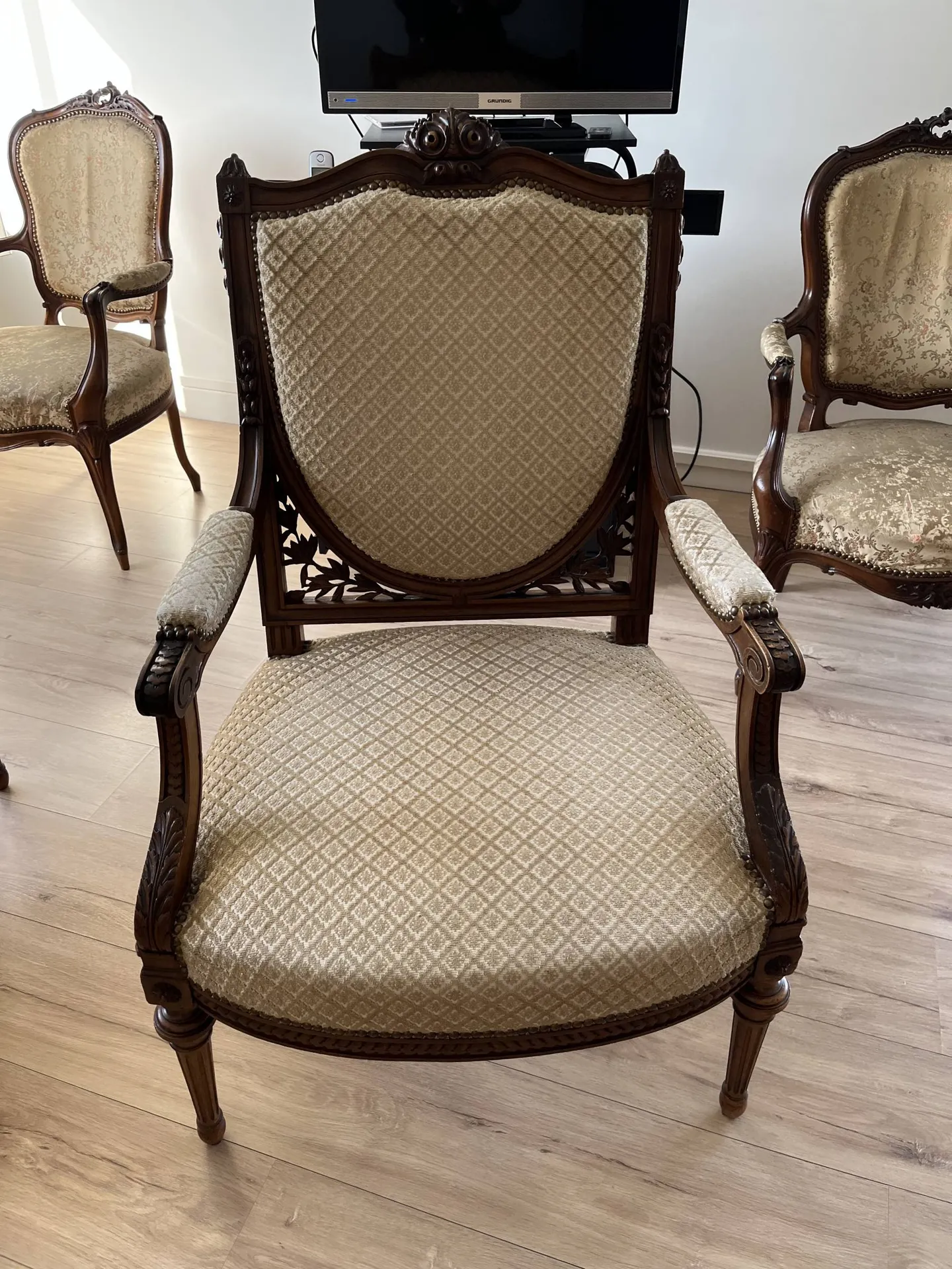 Dans cette réalisation en photo, des fauteuils qui ont été refaits en totalité dans un tissu bouclette de chez Nobilis réf Arctique. Et les petits fauteuils Cabriolet recouverts du tissu CASAL référence sangria.