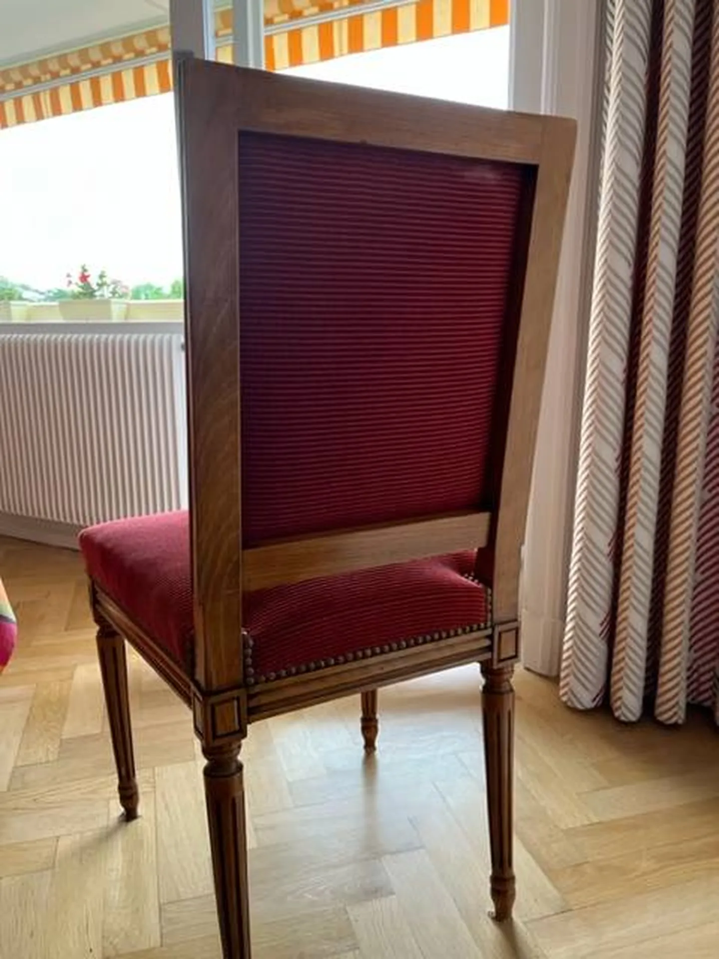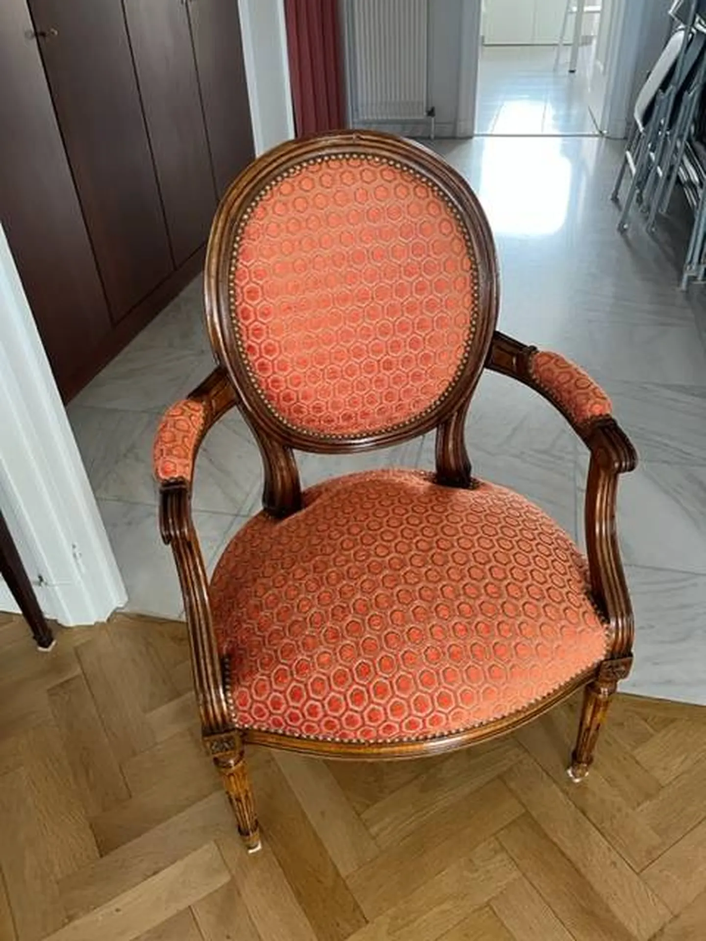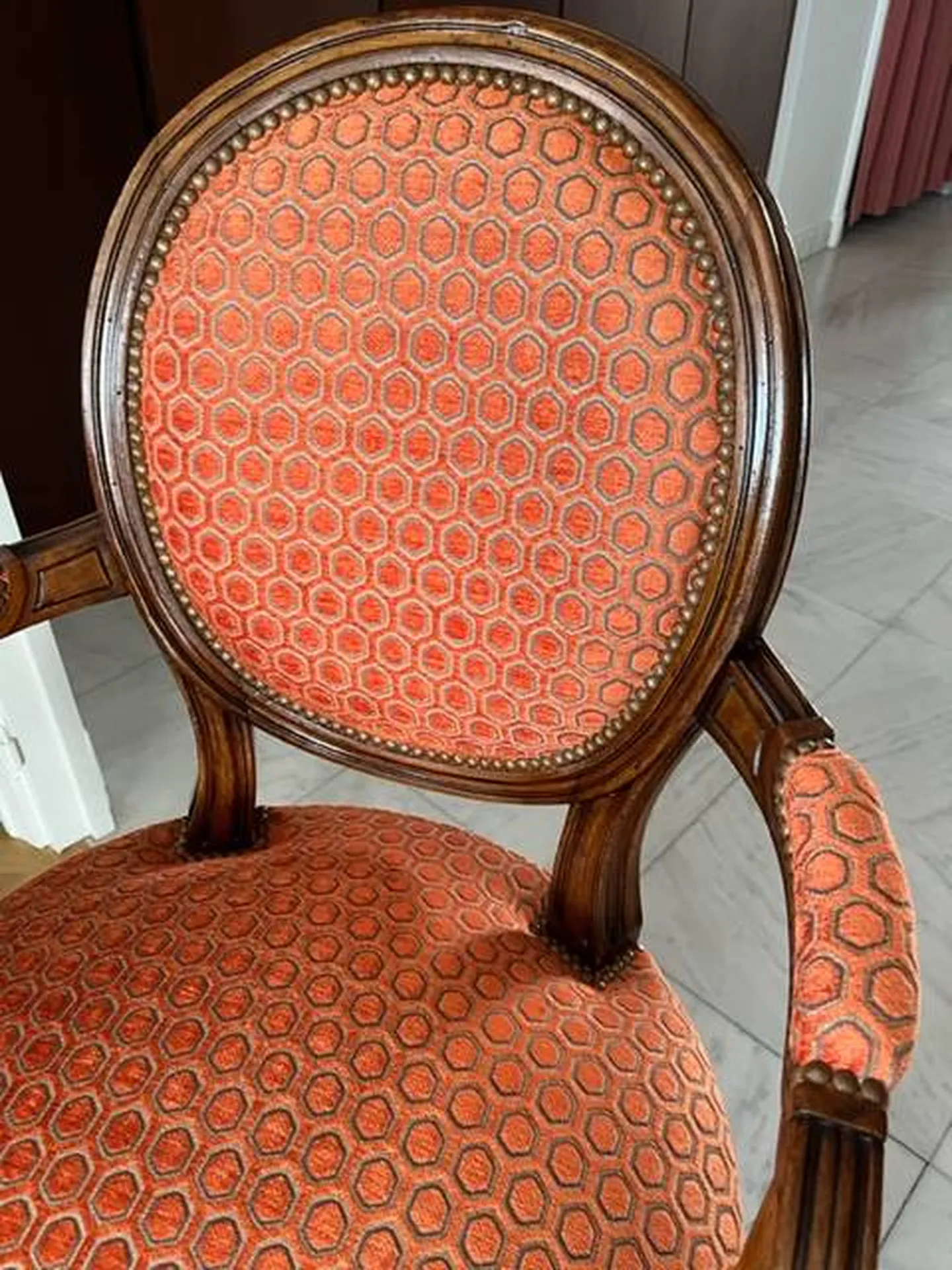 Réfection complète d'un fauteuil cabriolet et recouvrage de 6 chaises style Louis XVI dans un appartement à Ecully