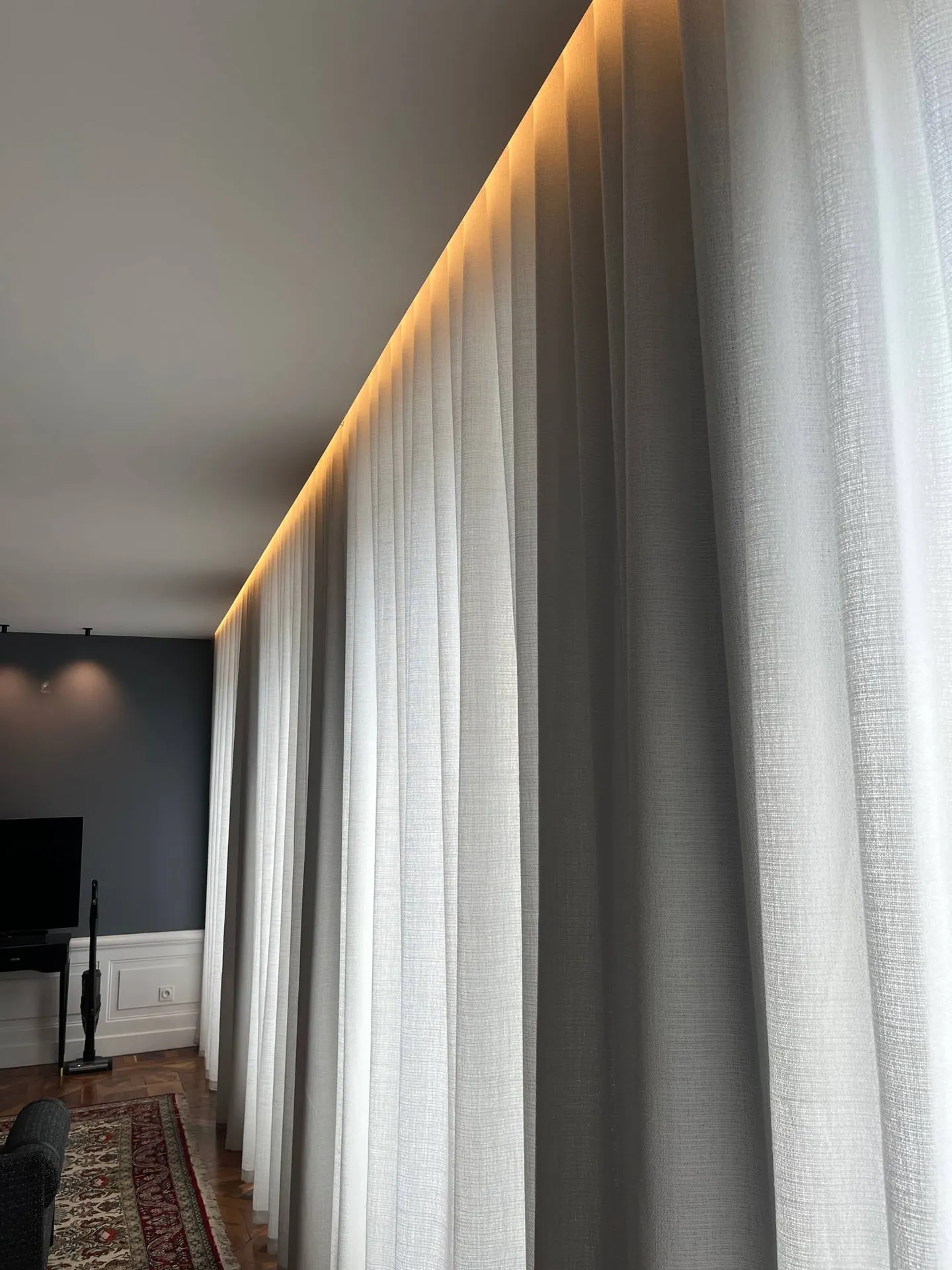 On vous présente cette belle installation réalisée pour un appartement situé sur les quais du Rhône à partir du voile Morandi de chez Zimmer Rhode.